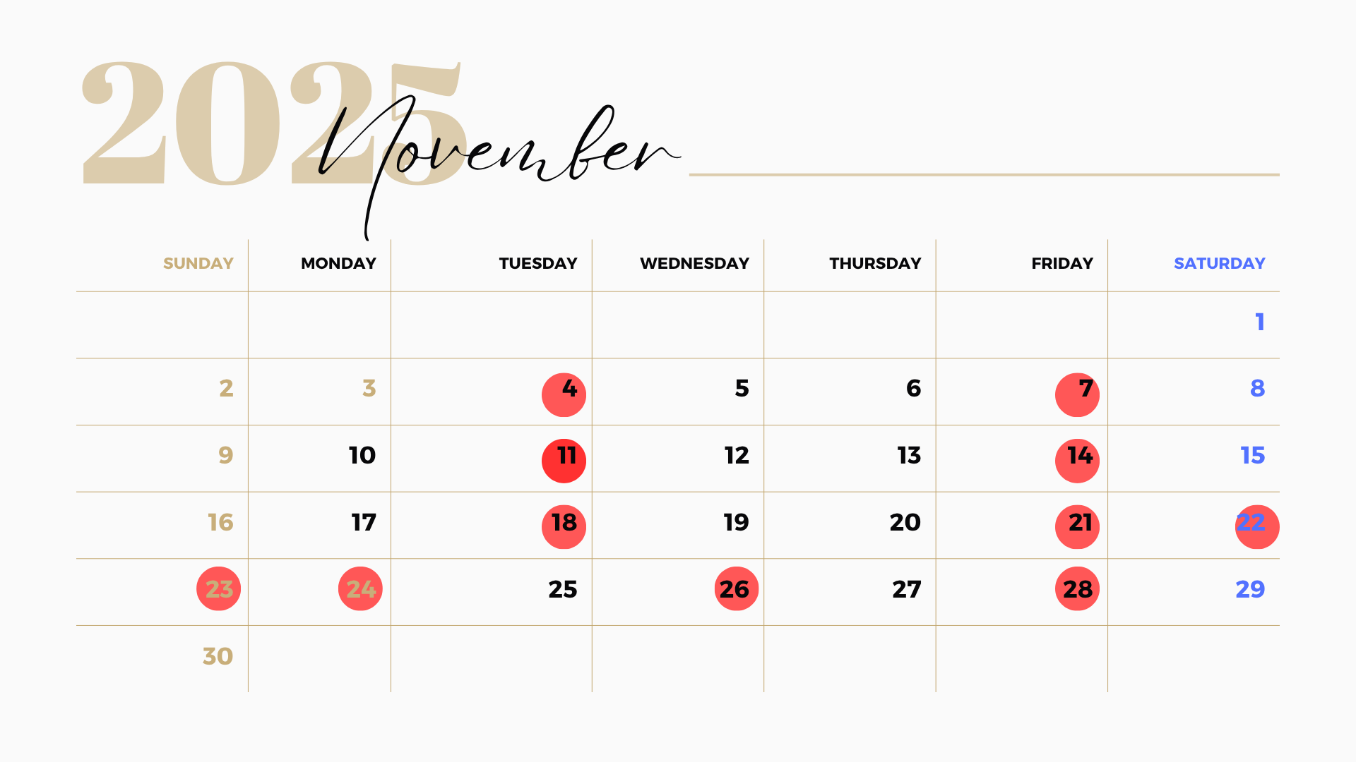 11月の営業日をご確認下さい。 11月は毎年、早めの年末休暇とし、連休を頂いてお